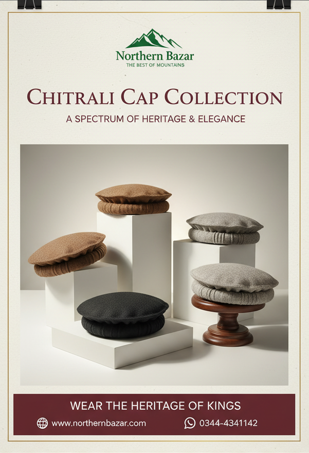 The Chitrali Pakhol, also known as the Chitrali Cap, is handcrafted from soft, pure wool. Worn for generations in the northern valleys, it represents culture, dignity, and elegance. Each Pakhol is designed to provide natural warmth and a royal look, making it perfect for winter wear and traditional occasions alike.